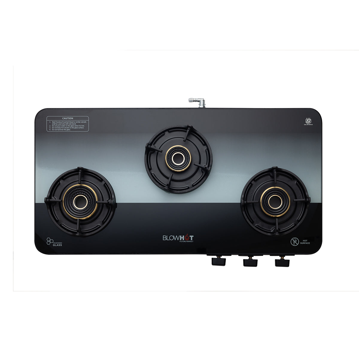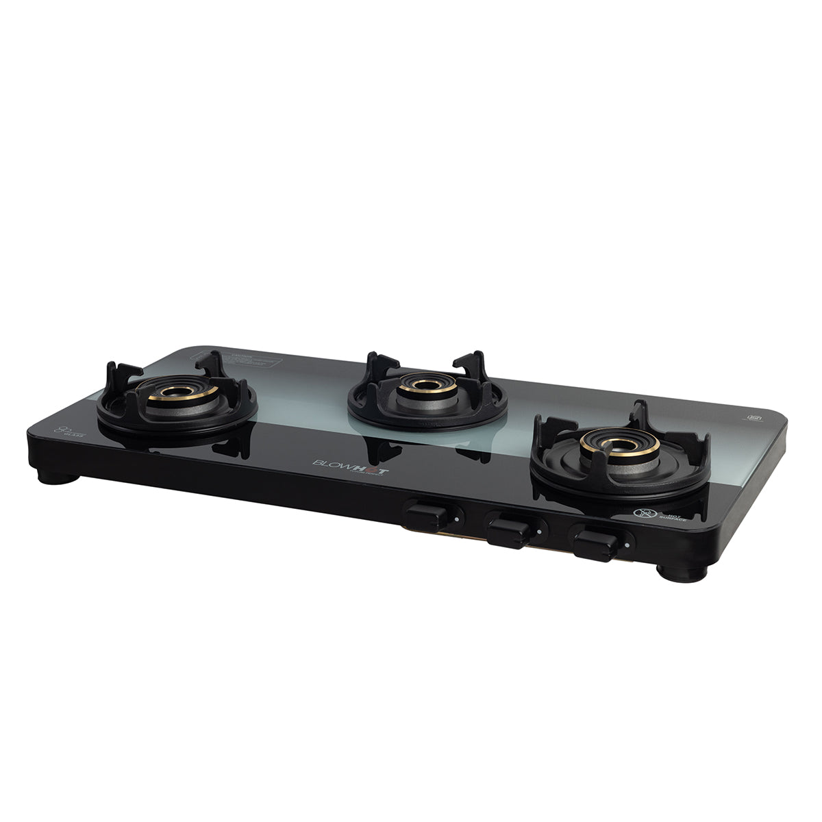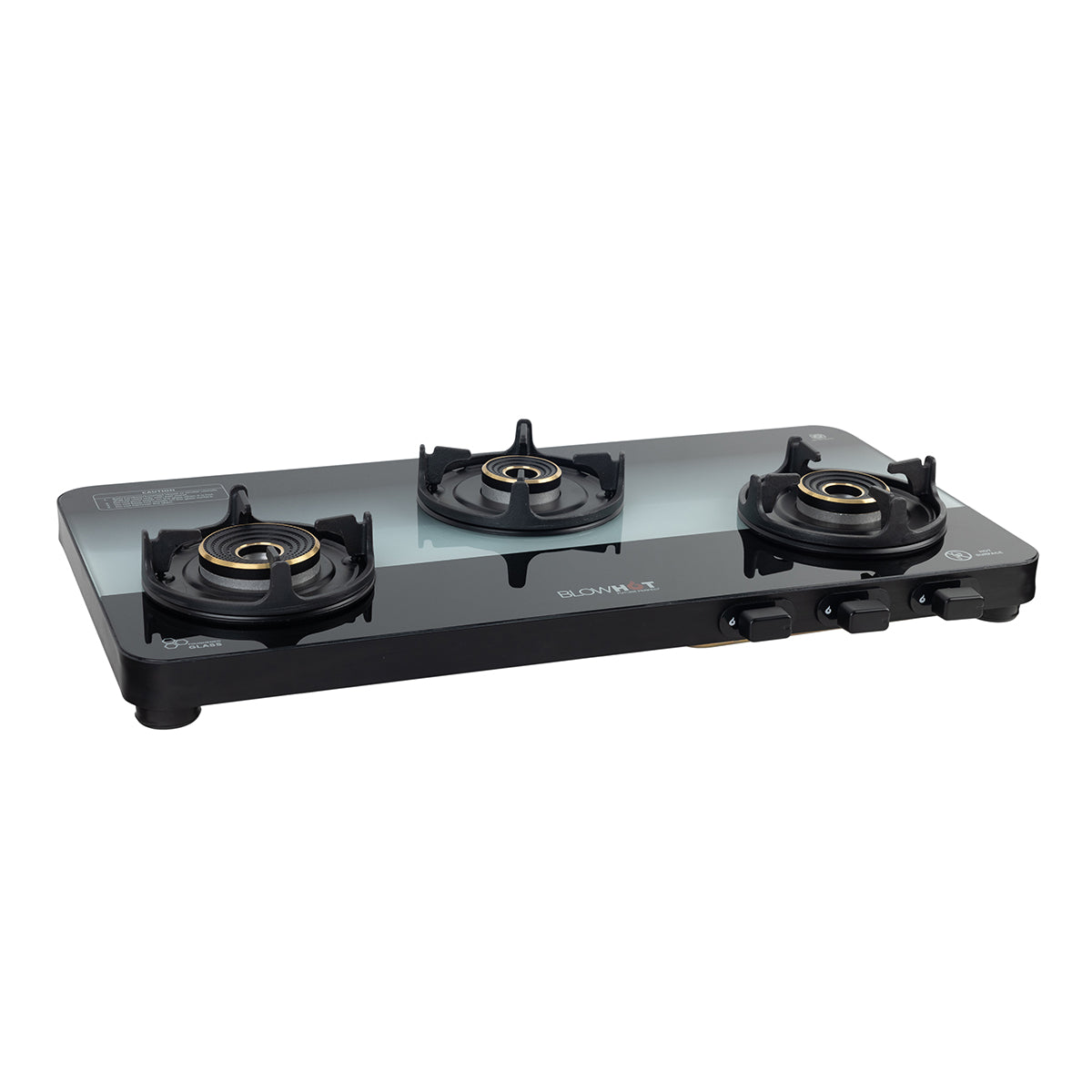 - Sapphire black Manual ignition gas stove with glass top is available in 2,3,4 Tornado Brass Burners with an Aluminium Frame with Ultra Slim body which is ISI certified.